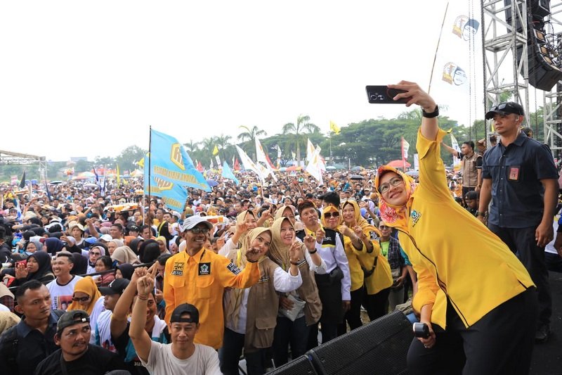 Ketua DPP Partai Golkar Airin Rachmi Diany turut memberi semangat tim pemenangan dan massa kampanye akbar pasangan calon bupati-wakil bupati Serang Andika Hazrumy-Nanang Supriatna di Modernland Cikande, Minggu (17/11/2024). Airin meminta masyarakat untuk memilih calon kepala daerah sesuai hati nurani.
