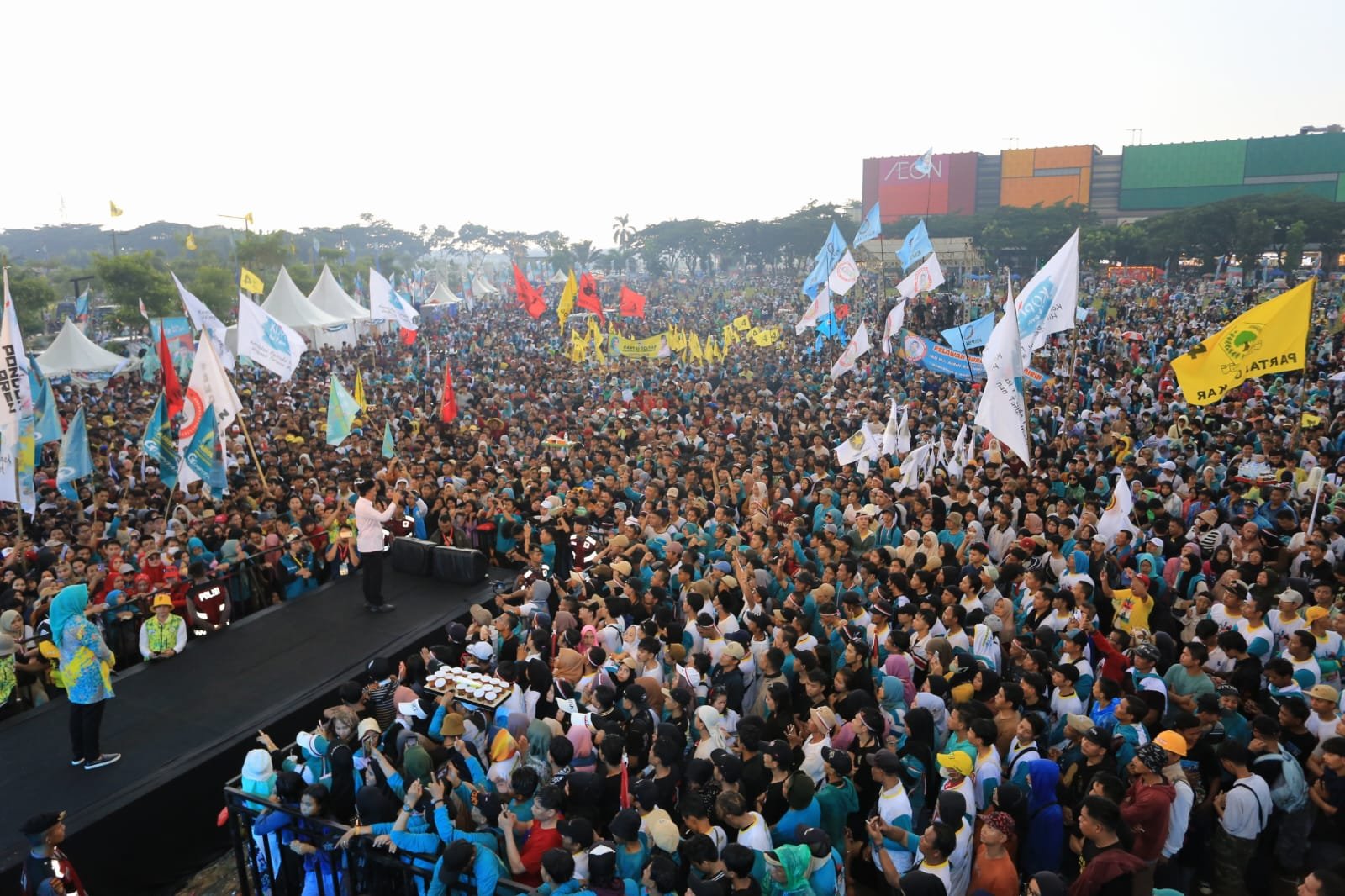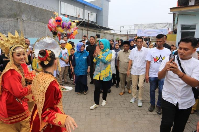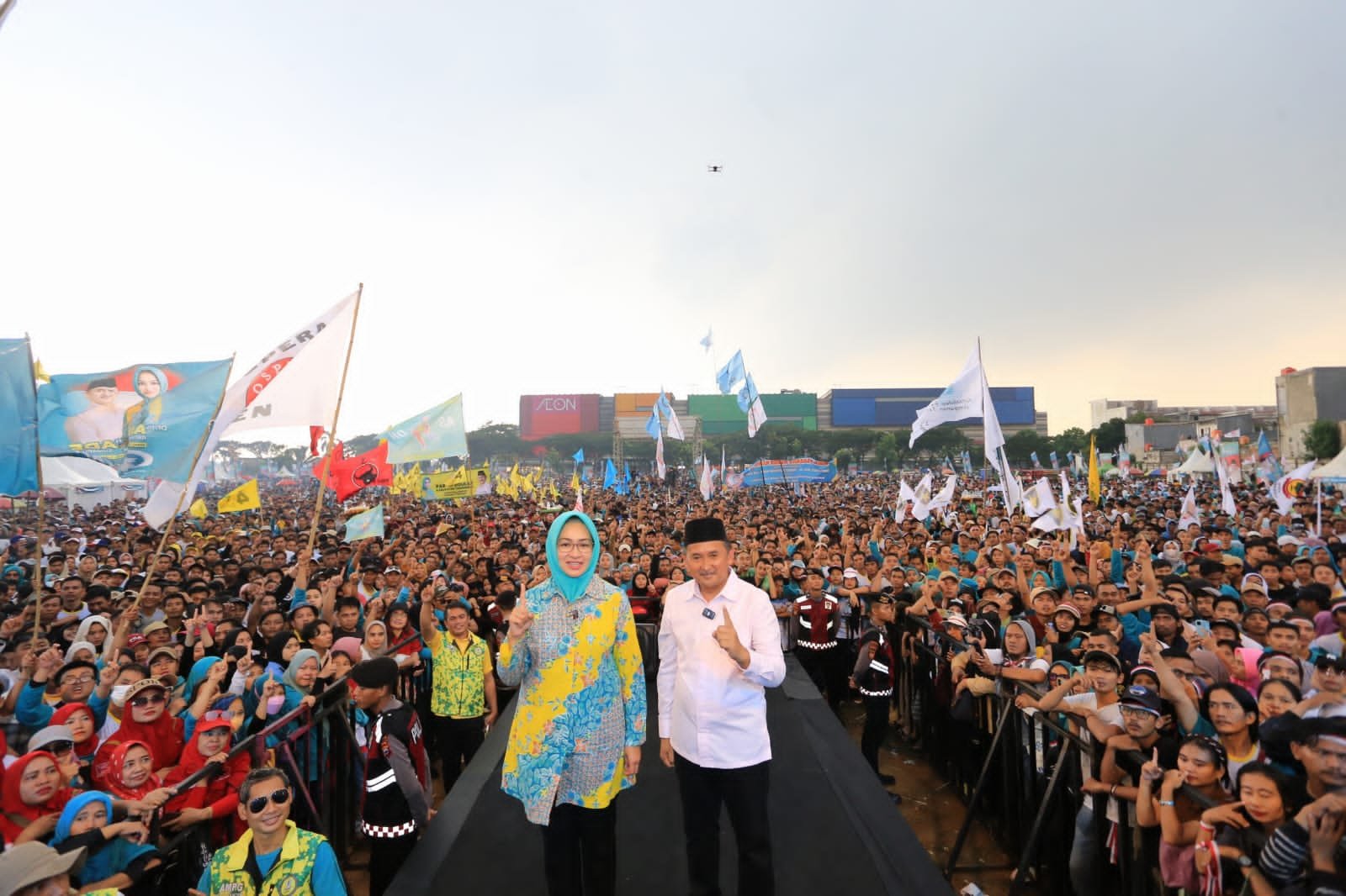 Ketua DPP Partai Golkar Airin Rachmi Diany turut memberi semangat tim pemenangan dan massa kampanye akbar pasangan calon bupati-wakil bupati Serang Andika Hazrumy-Nanang Supriatna di Modernland Cikande, Minggu (17/11/2024). Airin meminta masyarakat untuk memilih calon kepala daerah sesuai hati nurani.