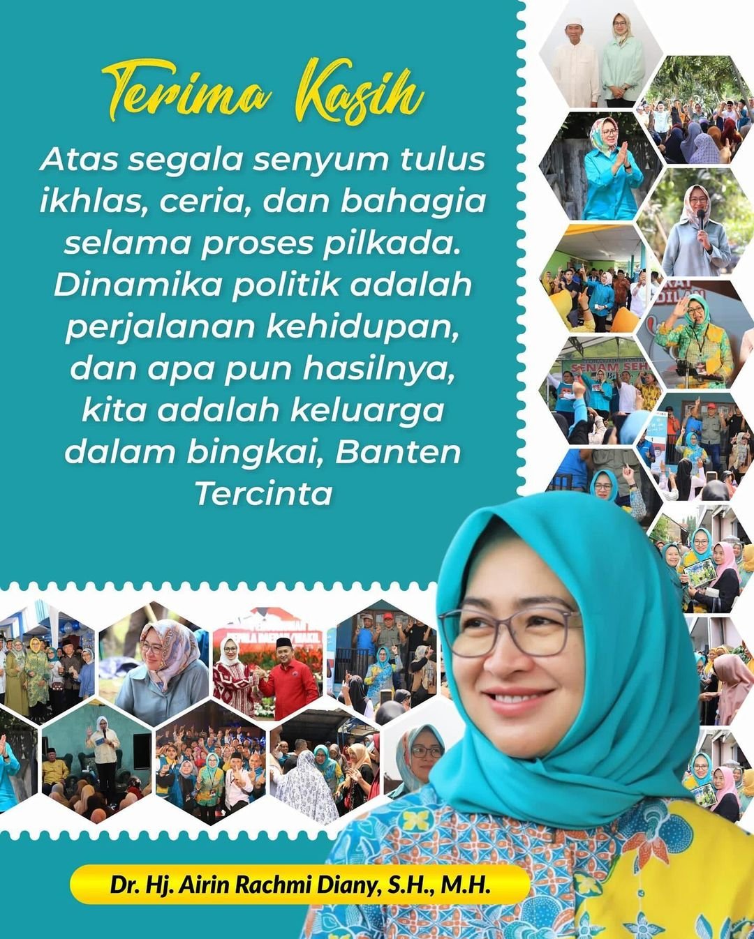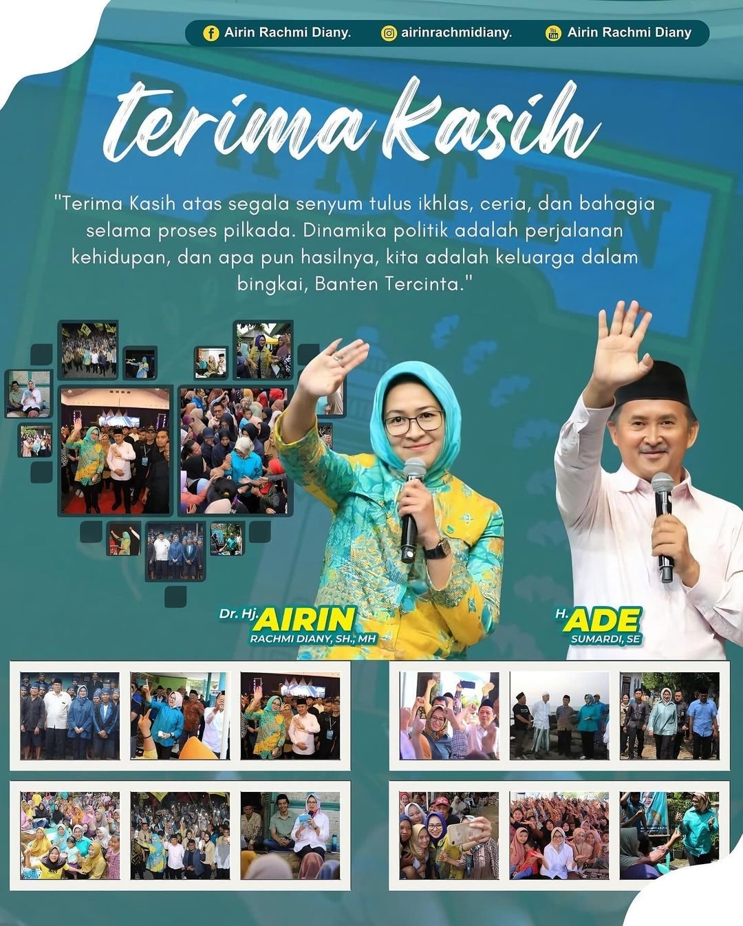 “Terima Kasih atas segala senyum tulus ikhlas, ceria, dan bahagia selama proses Pilkada. Dinamika politik adalah perjalanan kehidupan, dan apa pun hasilnya, kita adalah keluarga dalam bingkai, Banten Tercinta”